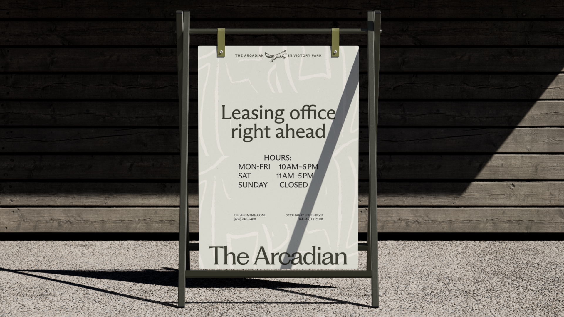 One idea that emerged (but didn’t make it to production): a series of bronze fox statues as a narrative marker, guiding pedestrians from the trail to the leasing office. The fox — native to the area — became a subtle mascot in spirit, if not in metal. The result is a cohesive, elevated brand system that speaks to place, people, and potential — all without breaking the trust of those already living there.